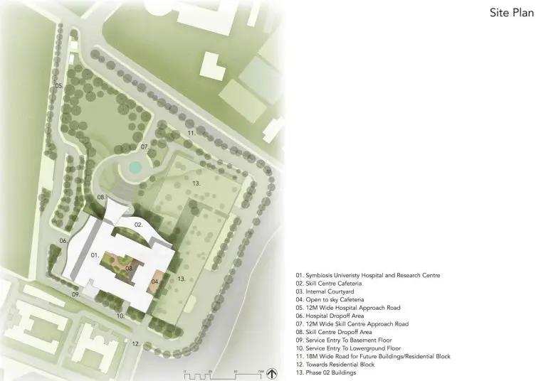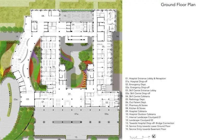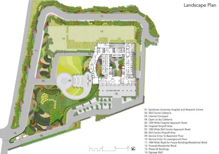 Symbiosis大學醫院和研究中心(SUHRC)占據Symbiosis國際大學在Lavale占地260英畝土地的山坡上,這是一家占地41,800平方米,擁有216張病床的多專科醫院,代表著一個嶄新的,進步的面貌印度的醫療保健基礎設施。憑借其最先進的醫療保健設施和增強技能開發的研究中心,它已牢固地立足成為COVID-19檢疫和治療設施,為馬哈拉施特拉邦抗擊疫情做出了貢獻。SUHRC的設計借鑒了親生物的思想(人類與生俱來的與自然和其他生命形式聯系的先天傾向),以促進患者和醫療保健專業人員的康復和復興。兩個開花的灌木叢和樹木環繞的大型庭院為室內帶來充足的日光和室外景觀,同時創建緩沖區以減少交叉感染。諸如重癥監護病房這樣的關鍵區域具有柔和的色調,以減輕焦慮。OPD沒有空調,但可以提供新鮮自然的空氣-從而減少了這些區域的氣流負載和功耗。從功能上講,該建筑包括四個部分。其中三個屬于醫院,最后一個是技能中心。醫院計劃分為五個級別;諸如OPD,傷亡,放射科,MHC等部門。