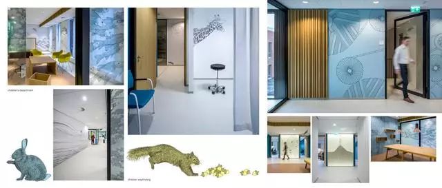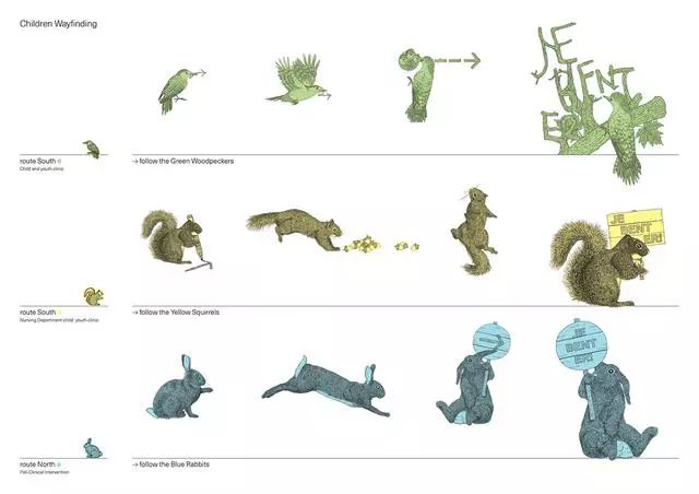 這個醫院還特別為孩子們設計了一套圖形導視系統。循著綠色啄木鳥、黃色松鼠和藍色兔子的腳印,去到一個個不同的醫療單元時,看病的心情或許會完全不一樣了吧。